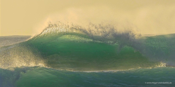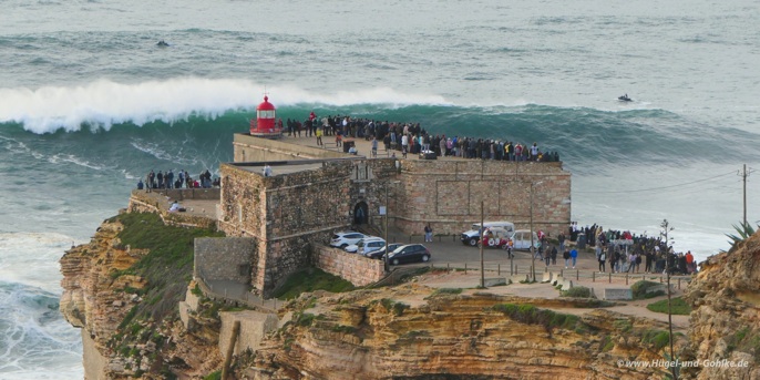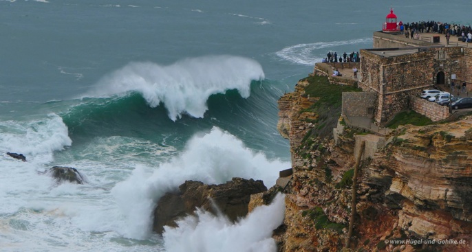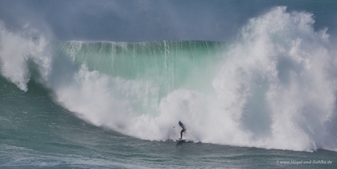 Eine kleine, ca. 20 m hohe, Monsterwelle. Gesurft im portugiesischen Nazaré.